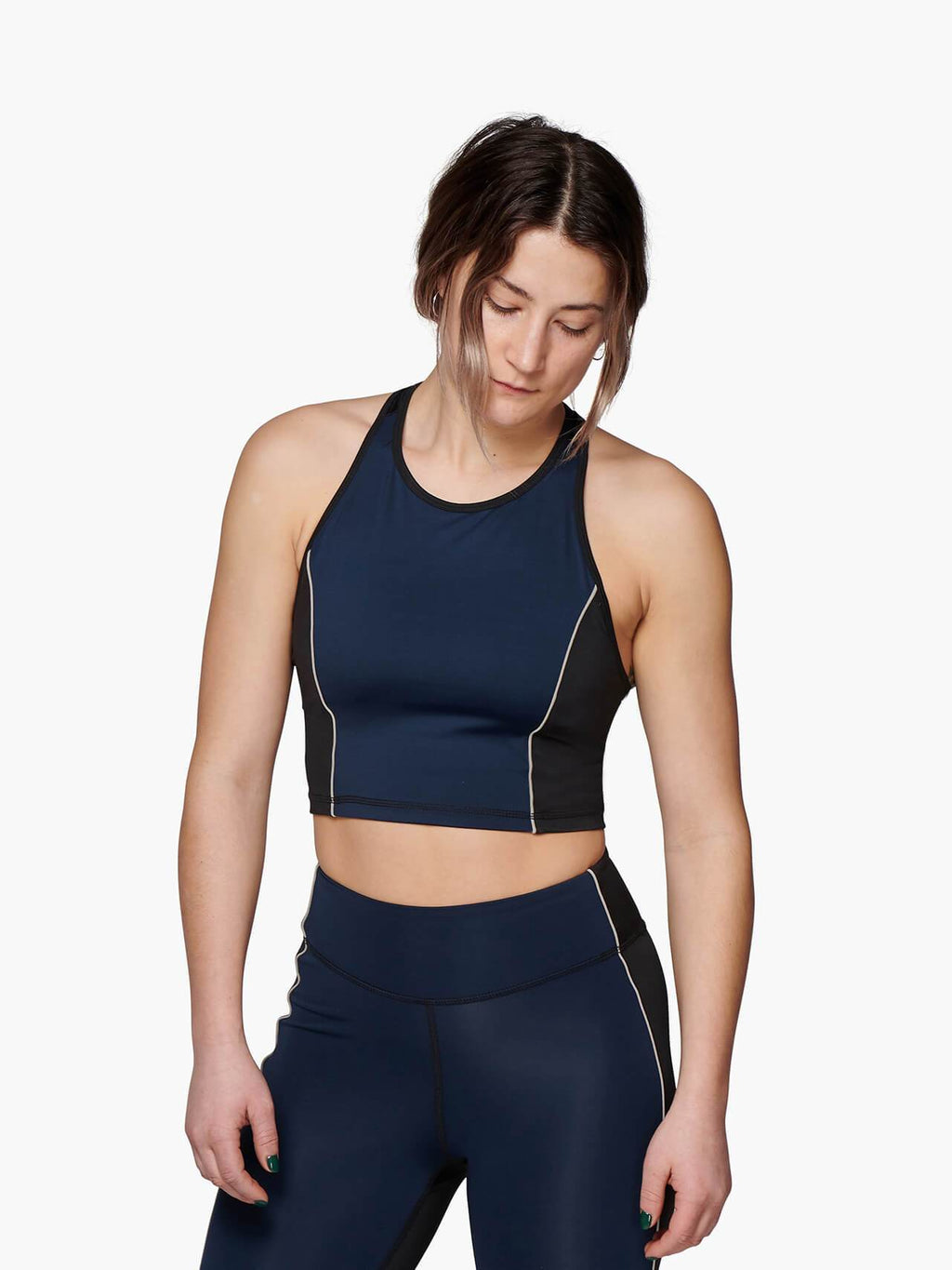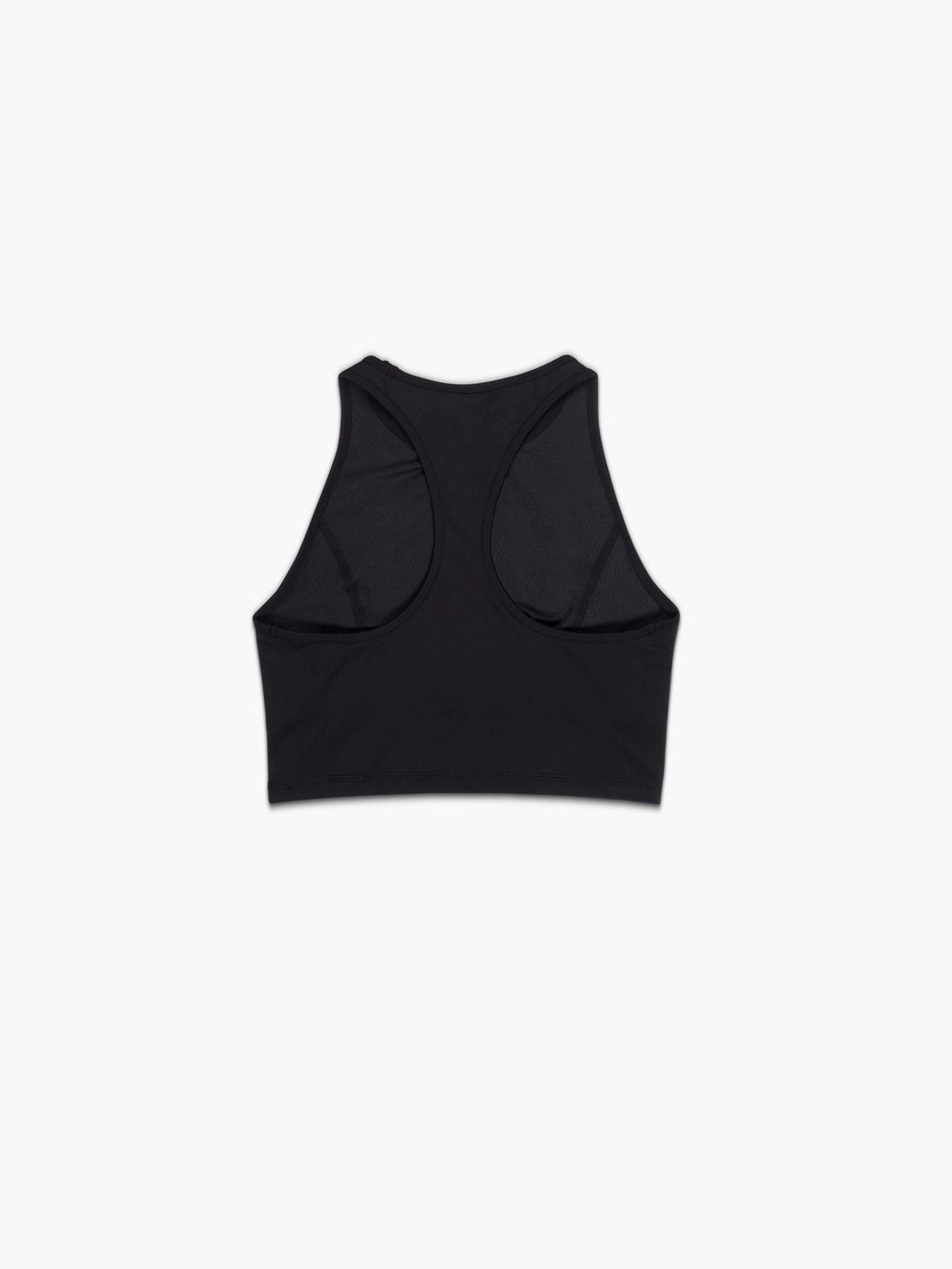 - Racerback design allows for a natural range of motion. High neckline keeps things in check.