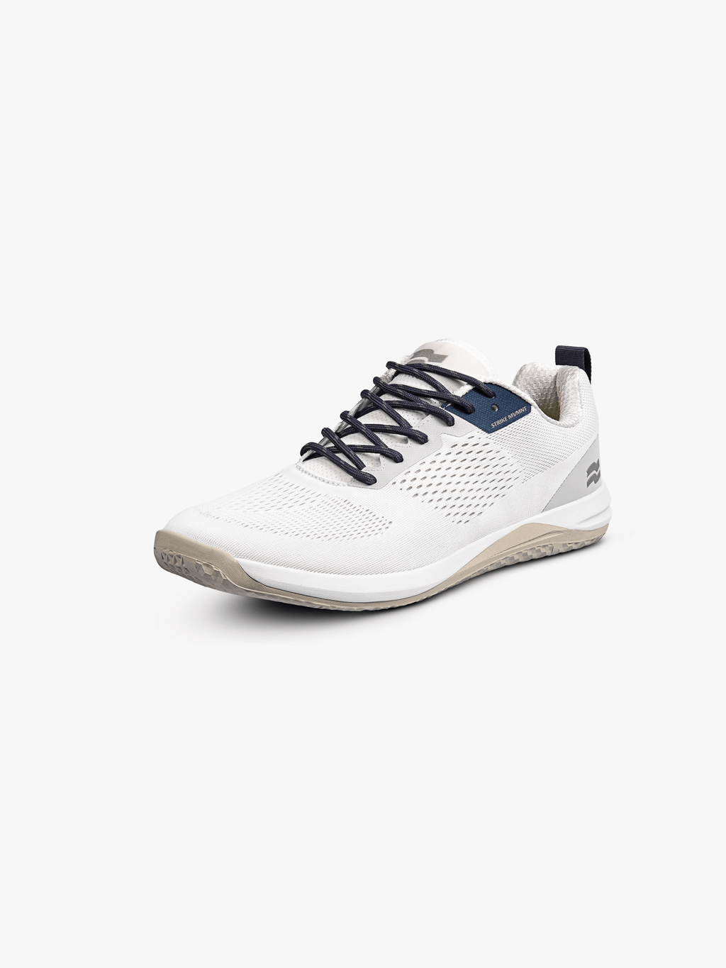 This shadowy white colorway with sand outsole features navy contrasting detail and reflective shoelace for visibility when on the move.
